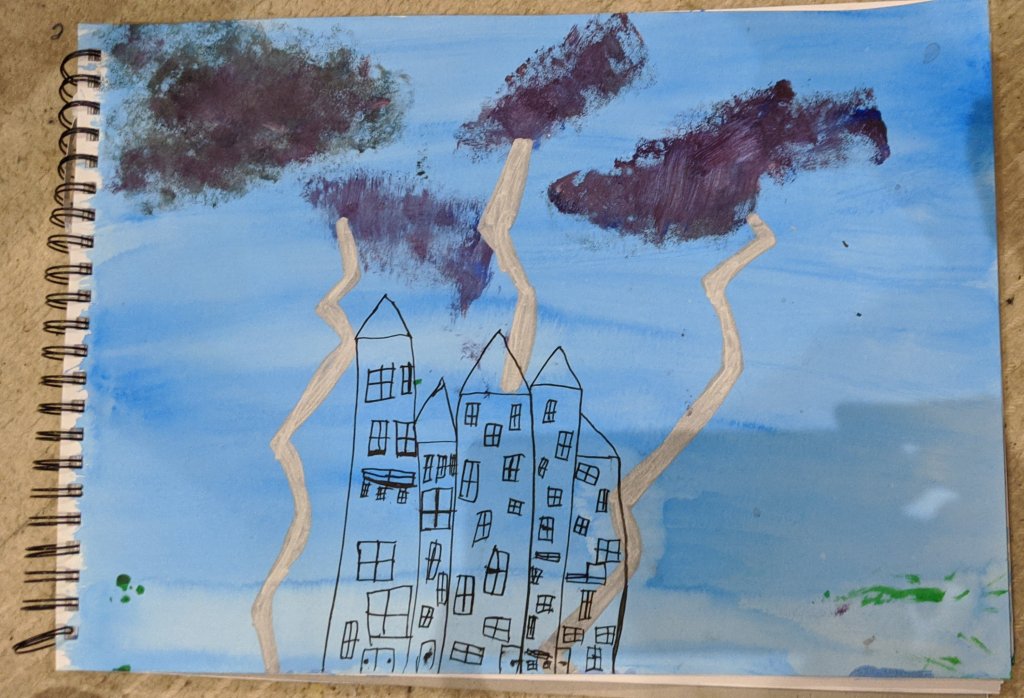 I soon had to stop to cuddle and soothe a sobbing Jess (8), who was feeling unexpectedly sad she wasn’t at school in a proper maths lesson with her friends. I gave some paints to Jess and suggested she paint an extreme weather conditions picture (one of the suggestions in the grid for this week’s topic), thinking I will worry about the mess later.