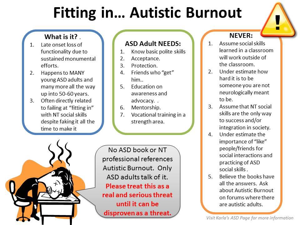 I can get easily overwhelmed, eventually tipping into autistic burn out – especially when I have to work on two different projects at the same time, with conflicting priorities, too many instructions communicated verbally, and long project meetings in which I am self-conscious of my meeting behaviours, which is draining. Autistic burnout manifests exactly like clinical depression for me.